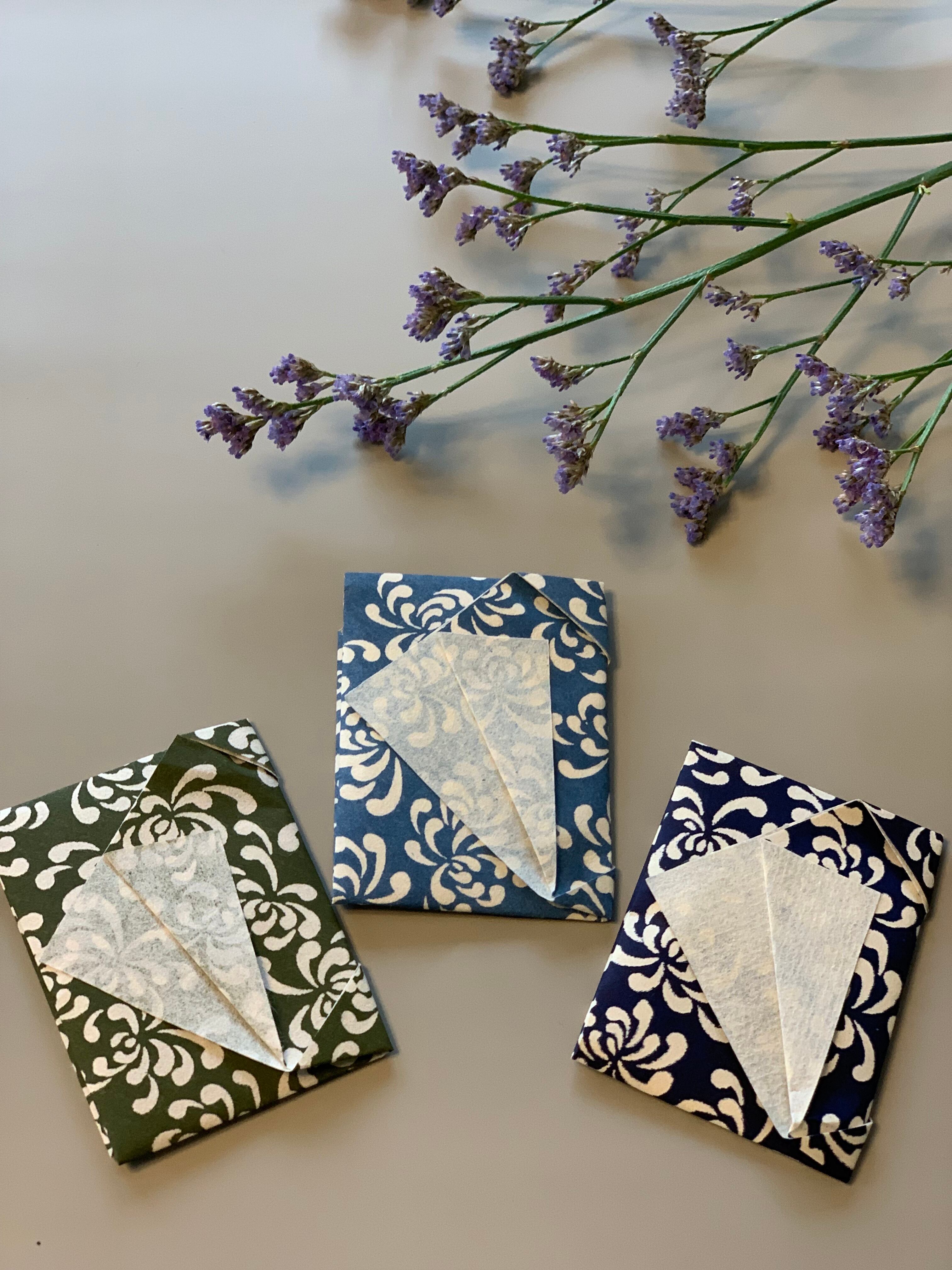 本物志向の方のために、お香マダム唯花厳選の日本独特の色づかいが美しい和紙で、お財布香を作りました。